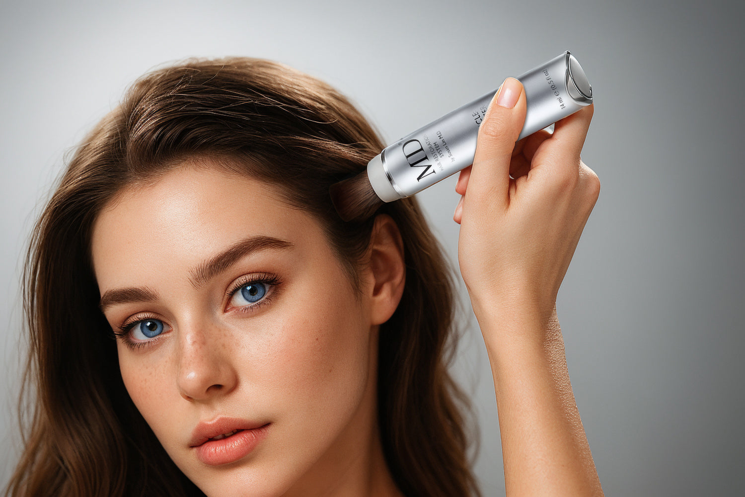 Close-up of MD Follicle Energizer precision brush applicator for targeted scalp treatment – drug-free hair regrowth serum from the MD Hair system